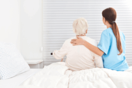 - Placez délicatement le patient sur son côté. Insérez la protection entre les jambes du patient par l’arrière.